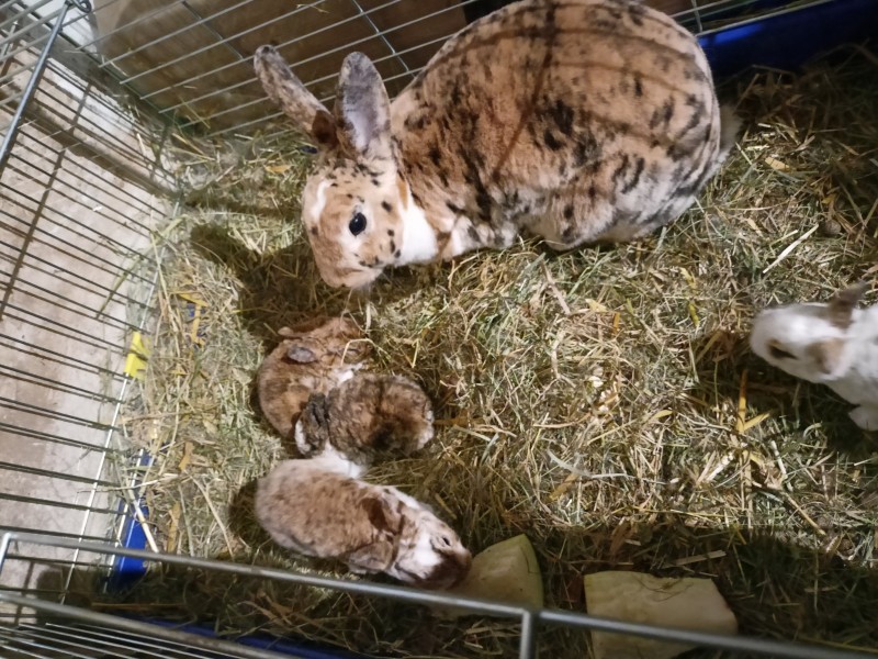 K této samičce jsem na výstavě v Nitře koupila cizího chovného samce původem z Rakouska. Ona však má jiné preference. Už dlouho sedávala v rohu klece s pohledem upřeným do sousední klece se zakrslým tříslovým samcem. Bohužel jsem před měsícem nezajistila dvířka klecí a dva zamilovaní králíci si vyšli na rande a máme výsledek.