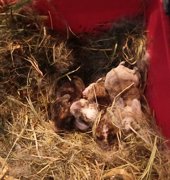 20.4.2025 Narozená mláďata MRex čž Sheila x Tonda - celkem 6 ks, narozená v kleci ve vnitřní zděné části voliér